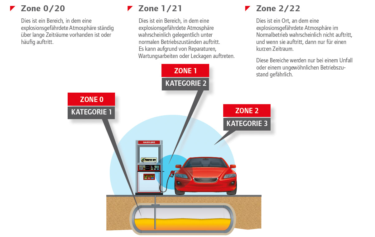 - Zone 0: dauerhaft explosionsfähige Atmosphäre
